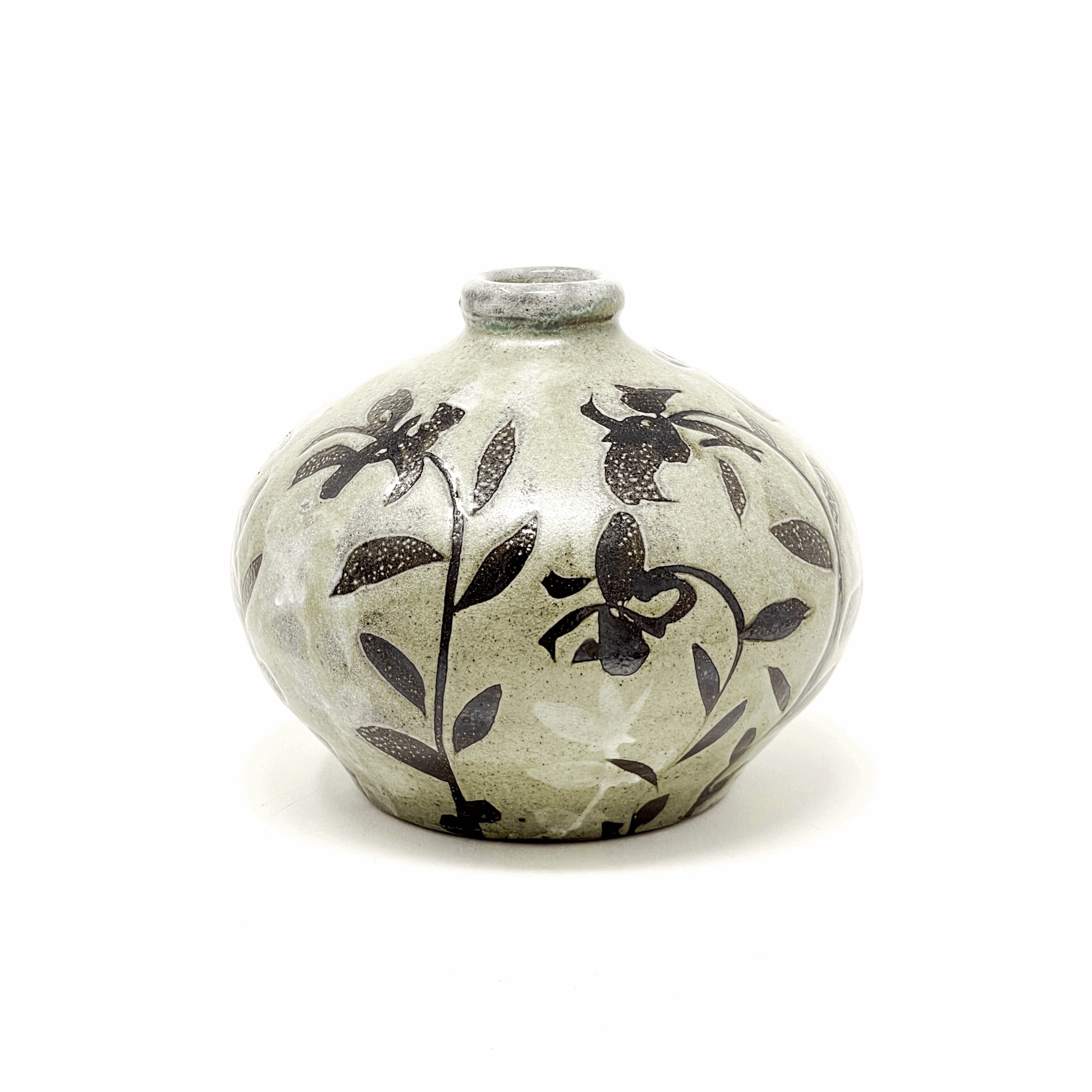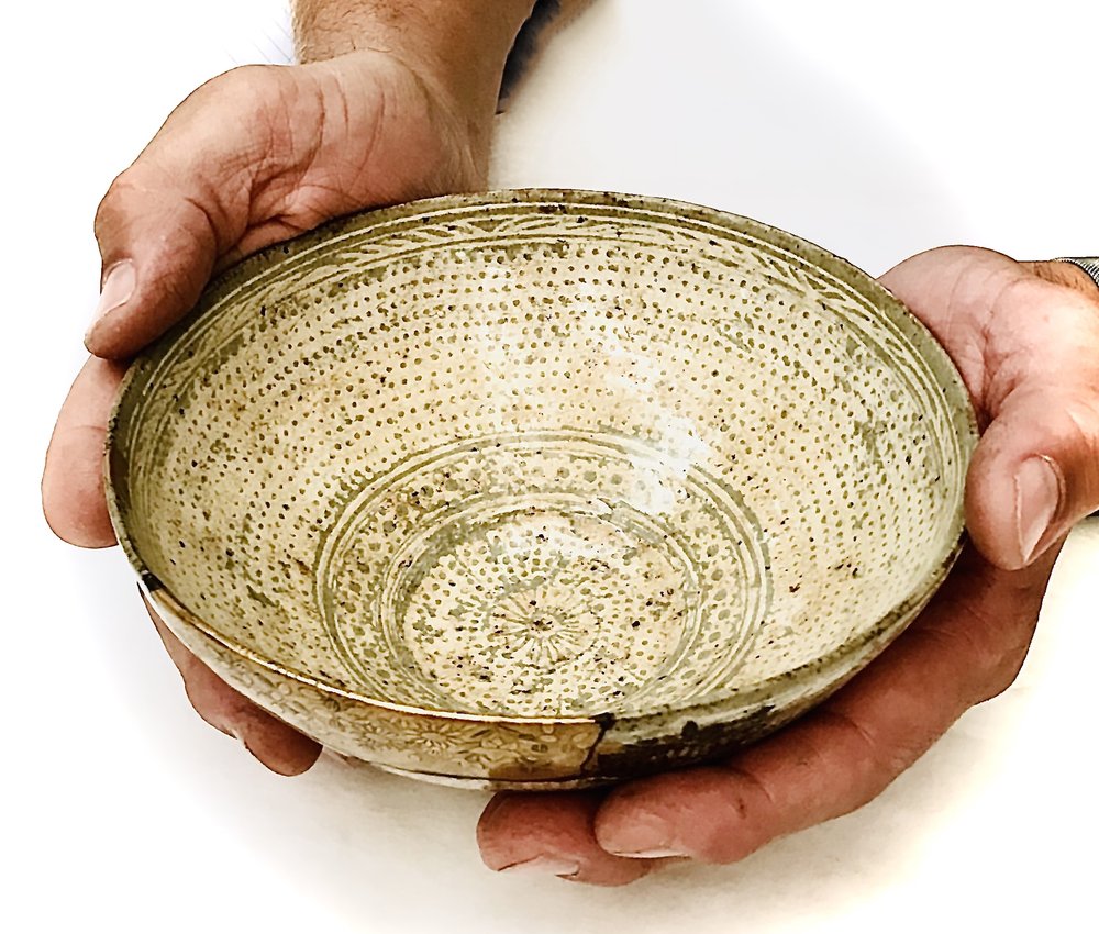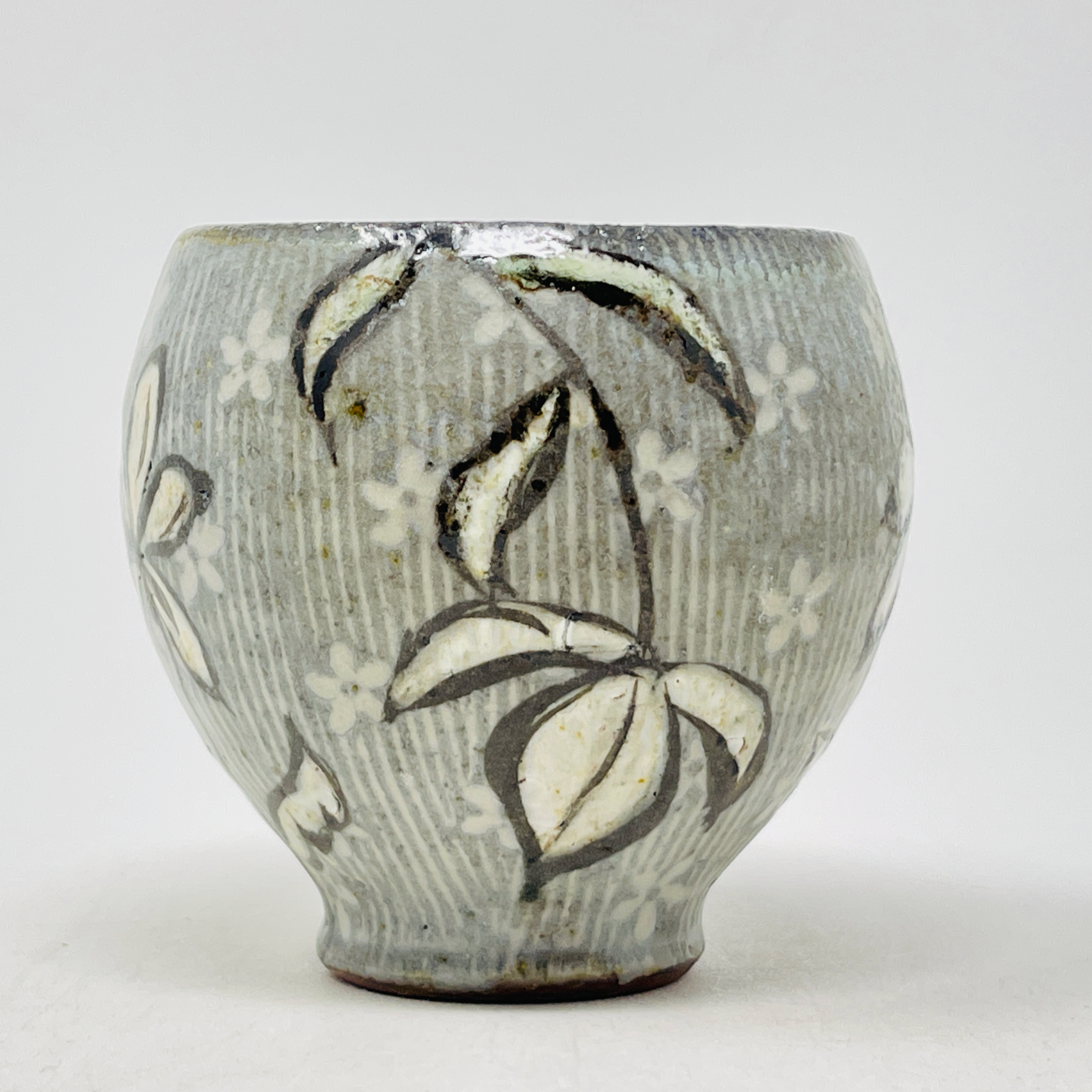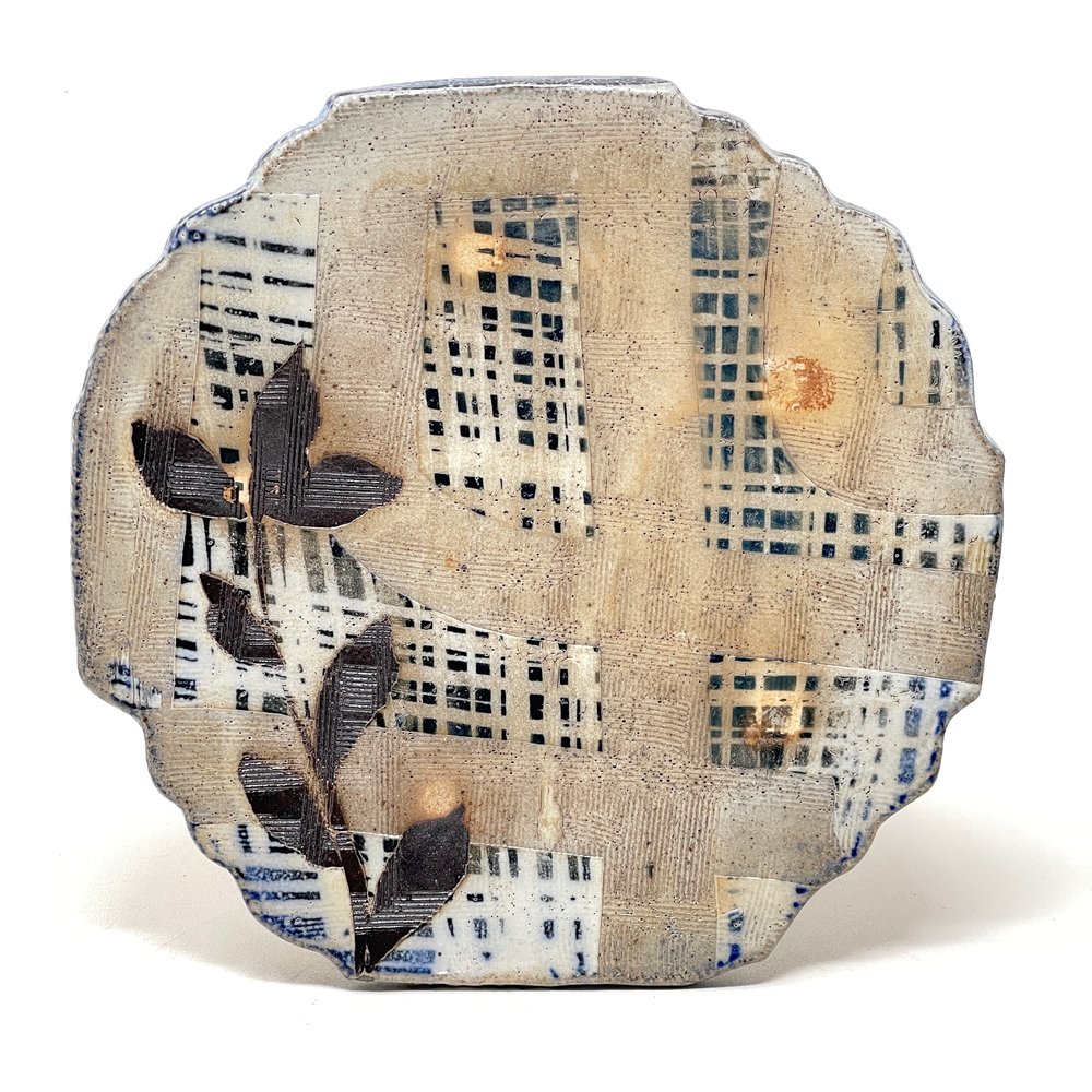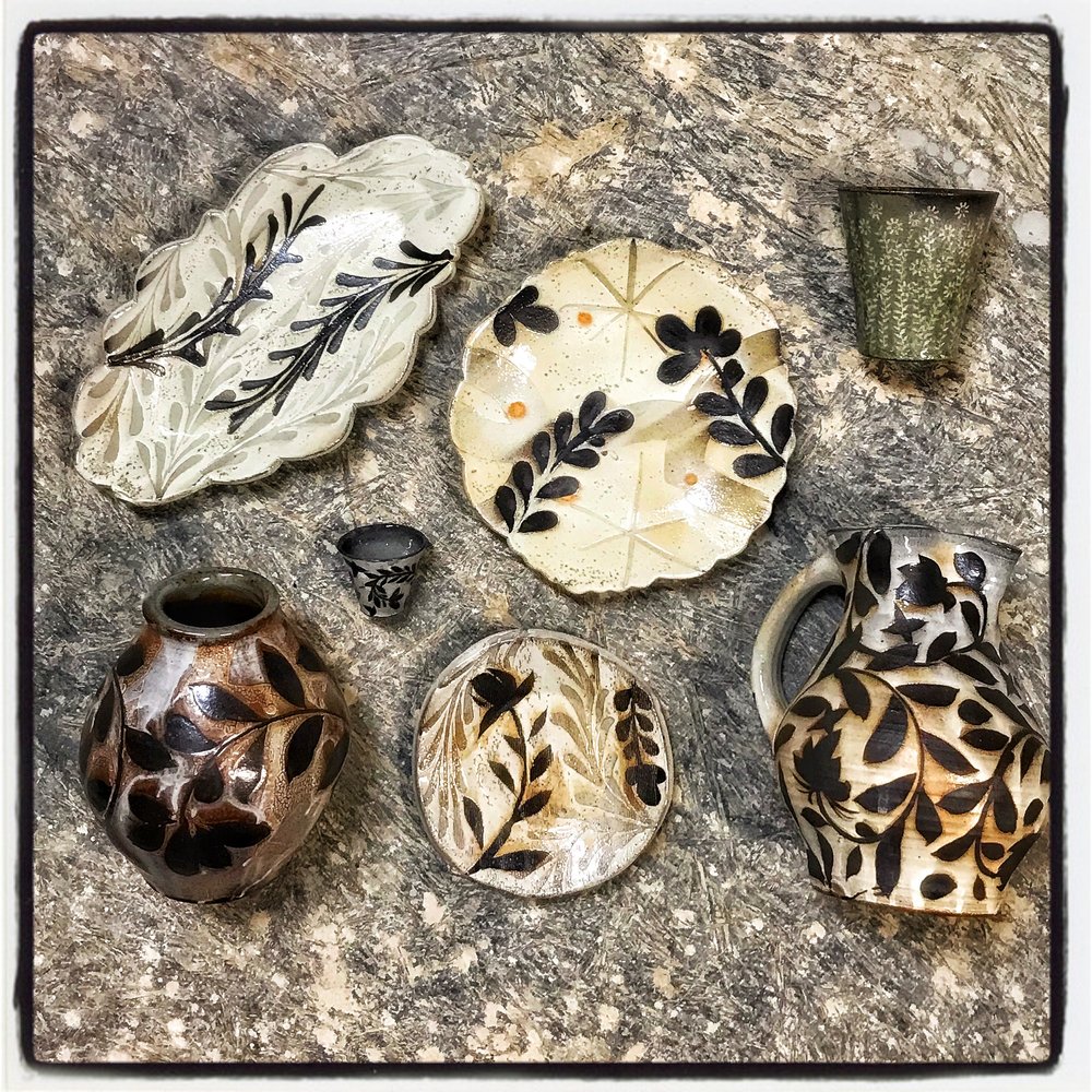 Michael Kline makes utilitarian ceramics with botanical-themed painted and stamped surfaces. For most of his career, Kline has worked with wood-fired salt-glazed stoneware, usually with organic patterns painted on a thick white slip surface, glass”runs,” and an alkaline ash glaze. As a resident at Penland (1998 – 2001), he began making large pots inspired by the traditional stoneware of Catawba Valley and Seagrove, North Carolina. He also briefly experimented with translucent porcelain in 2000, the floral patterns becoming a raised, topographical feature. In 2015 he visited the Smithsonian’s National Museum of Asian Art and was struck by 15th C. examples of the Korean sanggam technique. Since then, he has focused on applying this technique to his own work and aesthetic, creating floral stamps and inlaying the impressions with white slip on a dark stoneware base, and firing in a gas kiln. This body of work currently makes up a third of his output. Kline’s work is consistently identifiable in its delicate pattern systems contrasted with robust forms and somewhat coarse materials.