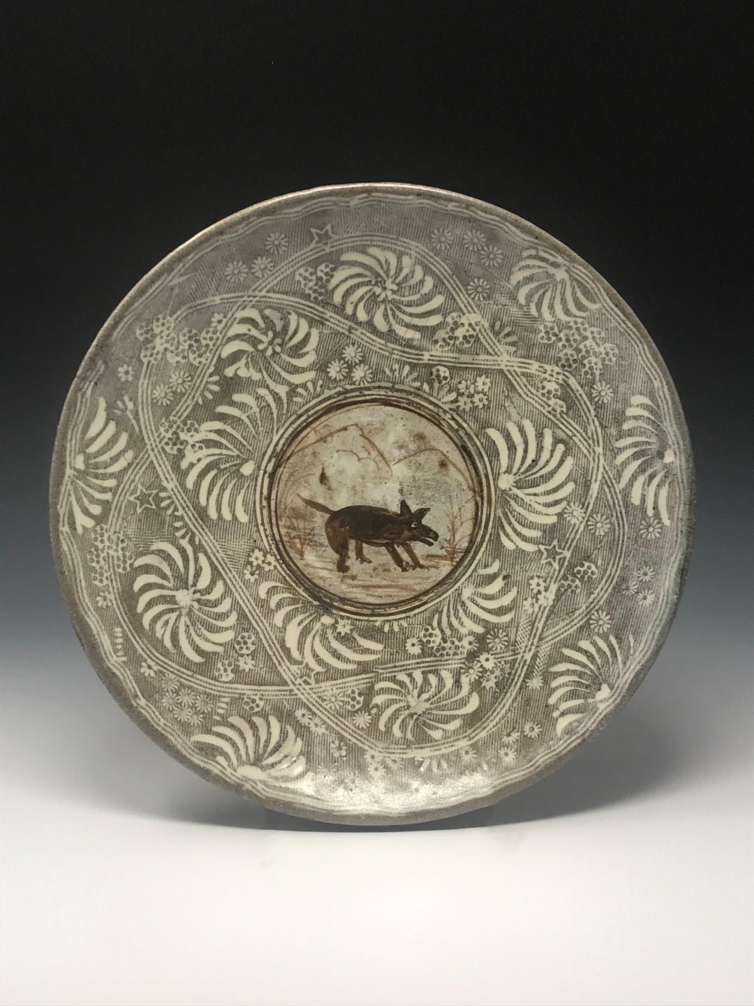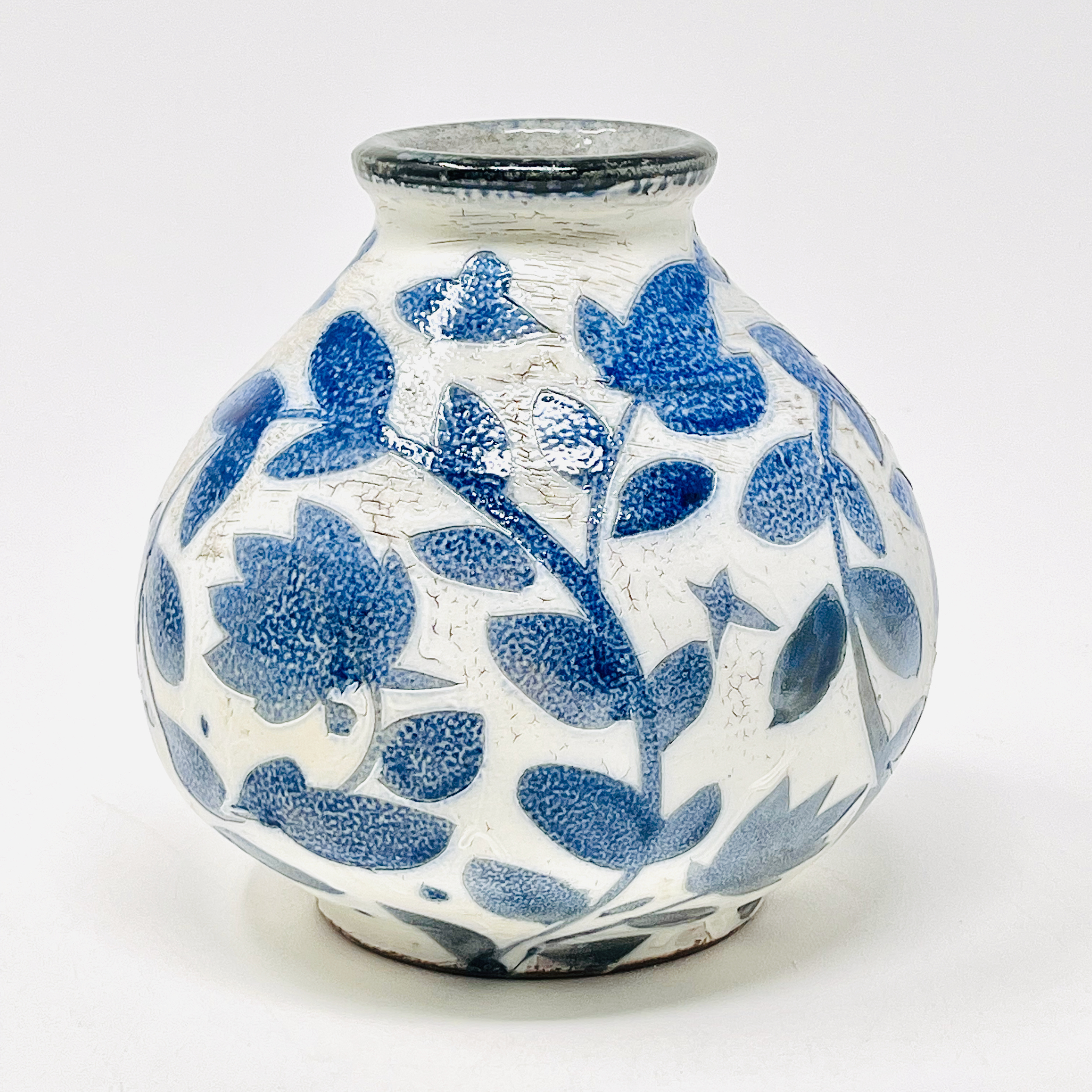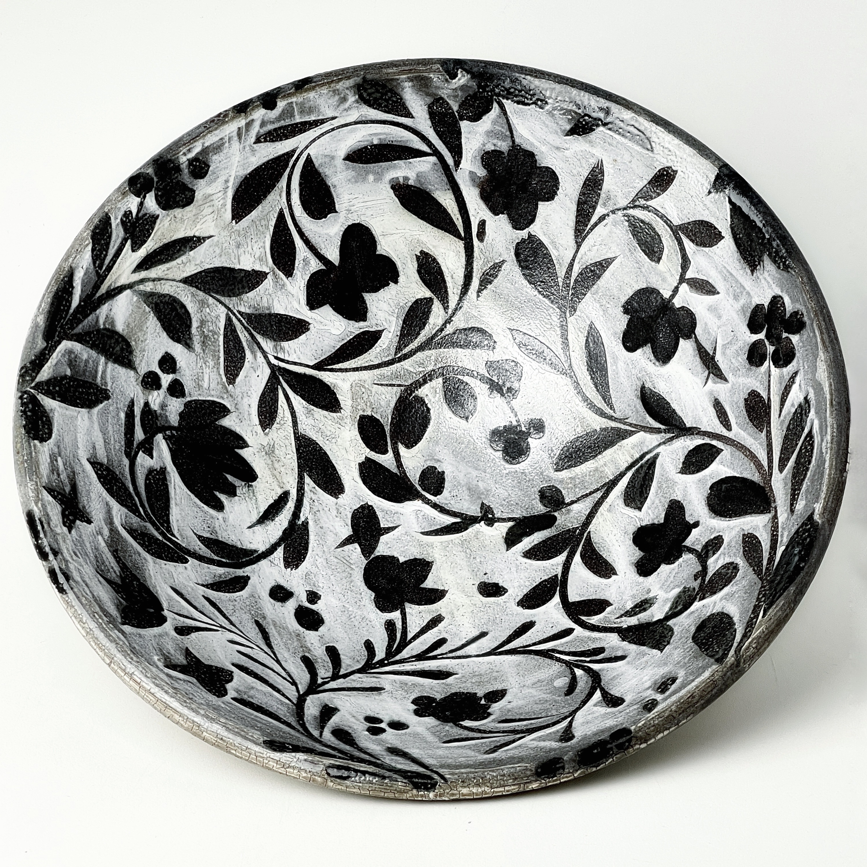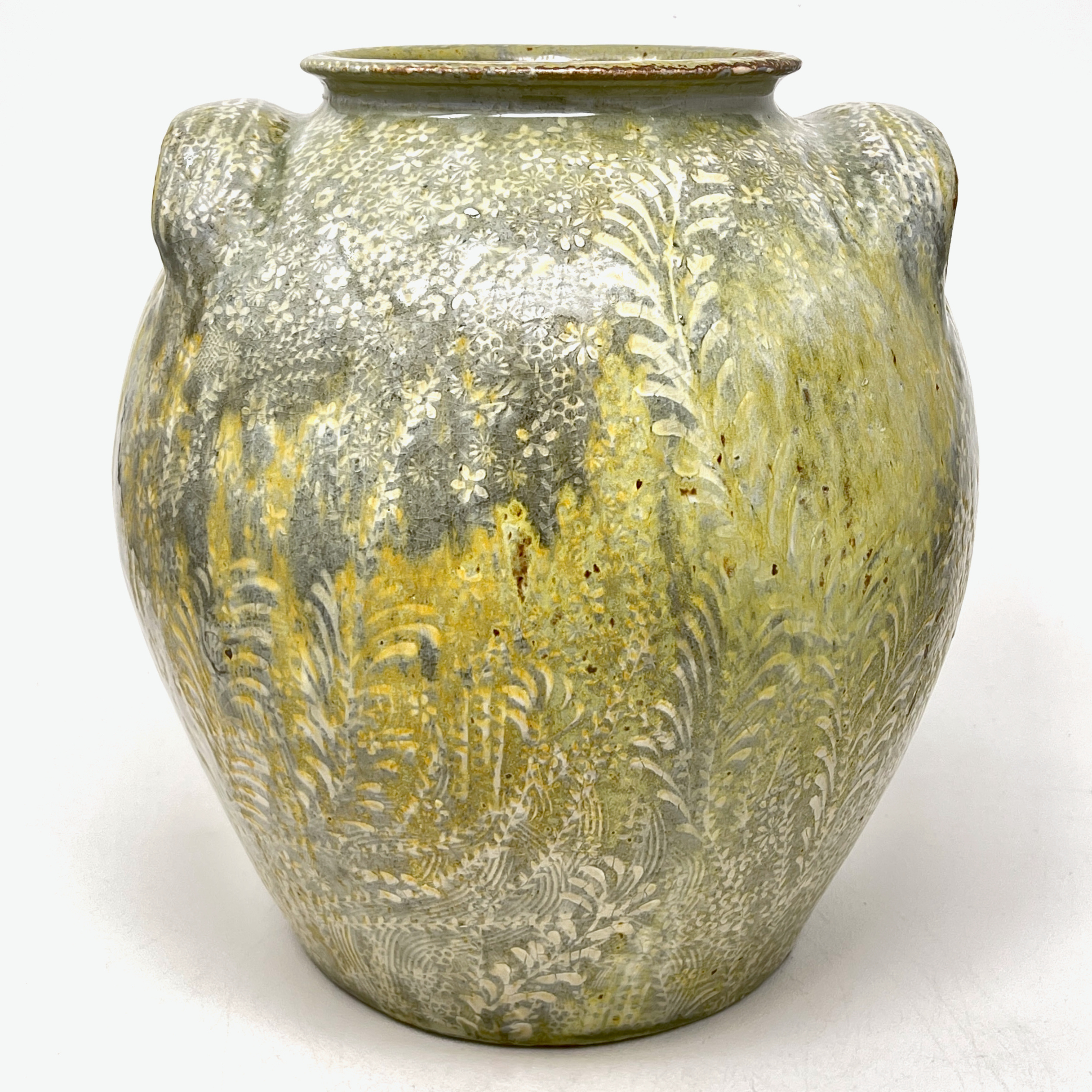 Michael Kline makes utilitarian ceramics with botanical-themed painted and stamped surfaces. For most of his career, Kline has worked with wood-fired salt-glazed stoneware, usually with organic patterns painted on a thick white slip surface, glass”runs,” and an alkaline ash glaze. As a resident at Penland (1998 – 2001), he began making large pots inspired by the traditional stoneware of Catawba Valley and Seagrove, North Carolina. He also briefly experimented with translucent porcelain in 2000, the floral patterns becoming a raised, topographical feature. In 2015 he visited the Smithsonian’s National Museum of Asian Art and was struck by 15th C. examples of the Korean sanggam technique. Since then, he has focused on applying this technique to his own work and aesthetic, creating floral stamps and inlaying the impressions with white slip on a dark stoneware base, and firing in a gas kiln. This body of work currently makes up a third of his output. Kline’s work is consistently identifiable in its delicate pattern systems contrasted with robust forms and somewhat coarse materials.