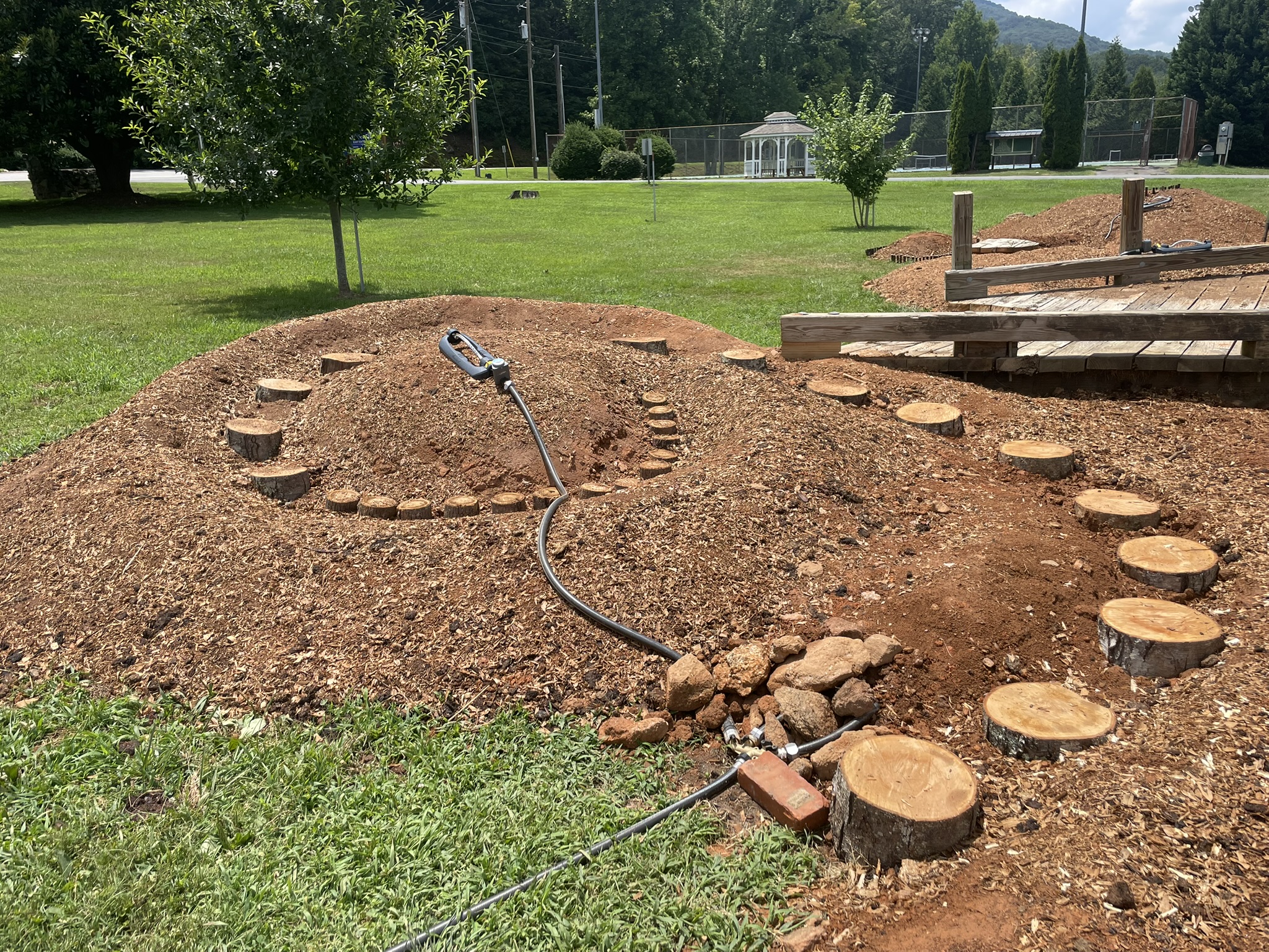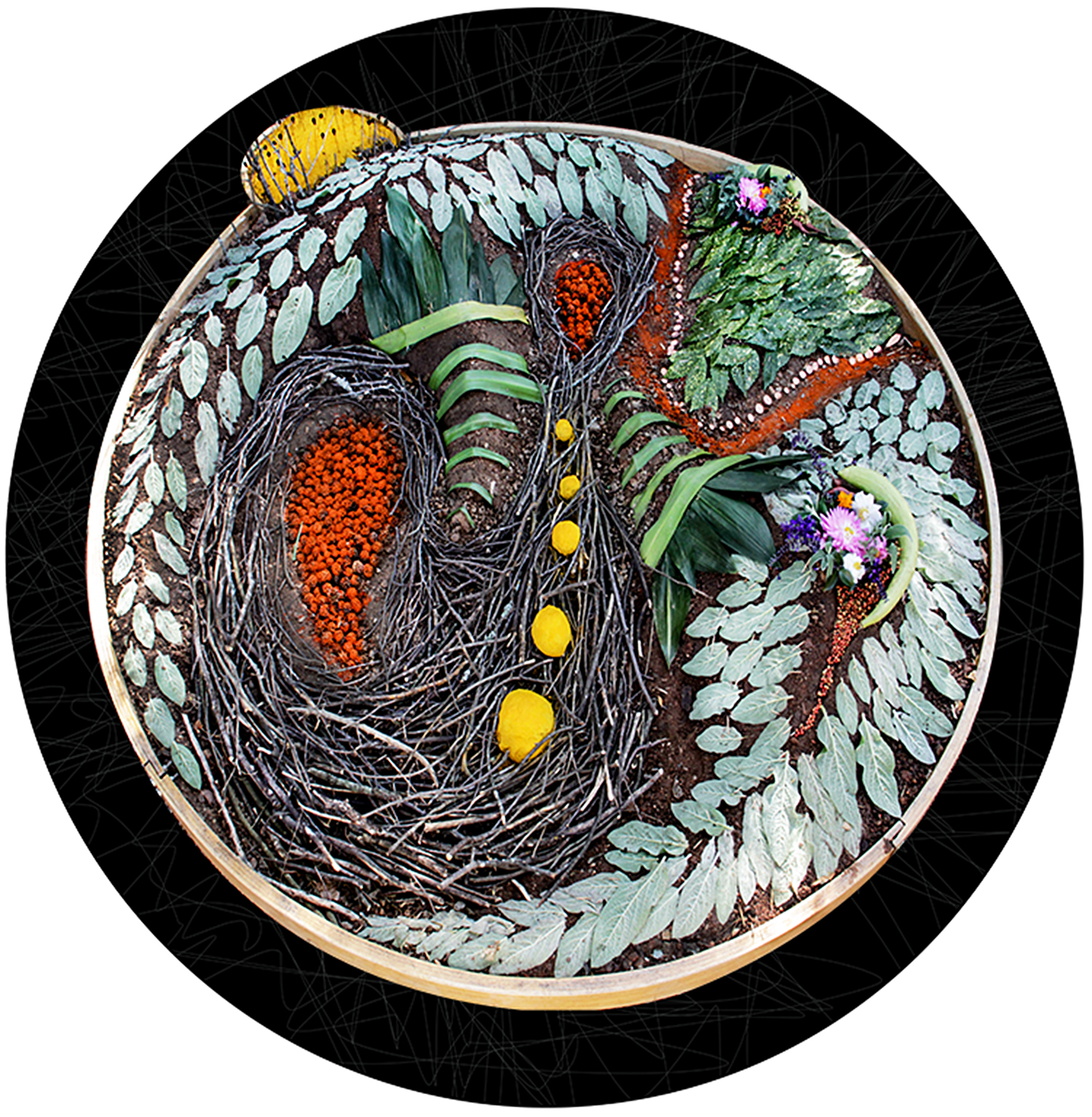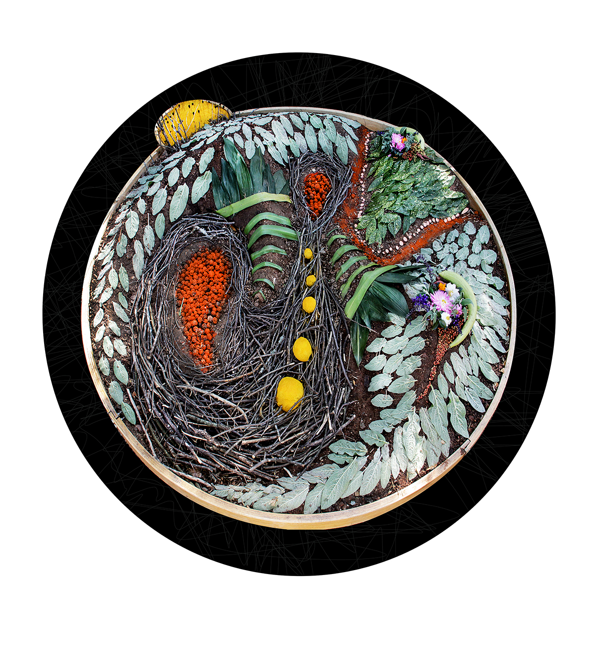 The work harkens back to the meaningful intentions of rituals such as Navajo sand paintings and Tibetan mandalas but also rises out of my own desire for a spiritual/creative practice to foster a intimate connection to the earth. Other musings for this work are derived from enthusiasm as a gardener, environmentalist, and for community. I lean into a creative labor, temporarily moving and manipulating the dirt on site by digging and molding the earth. The process becomes a very physical meditation and a collaboration. I later place collected flora and playfully, obsessively, re-arrange the nature of our background into a design of the foreground. I work with the elements and weather of the day, the invasive and the native plants, dead and alive; I work primarily with what is. I also employ the additional use of colorful spices on these localized forms, allowing me to enhance or contrast the aesthetics inherent to the surrounding nature. Within weeks or days, I lift my bent oak perimeters and all elements are sifted back into their place of origin.