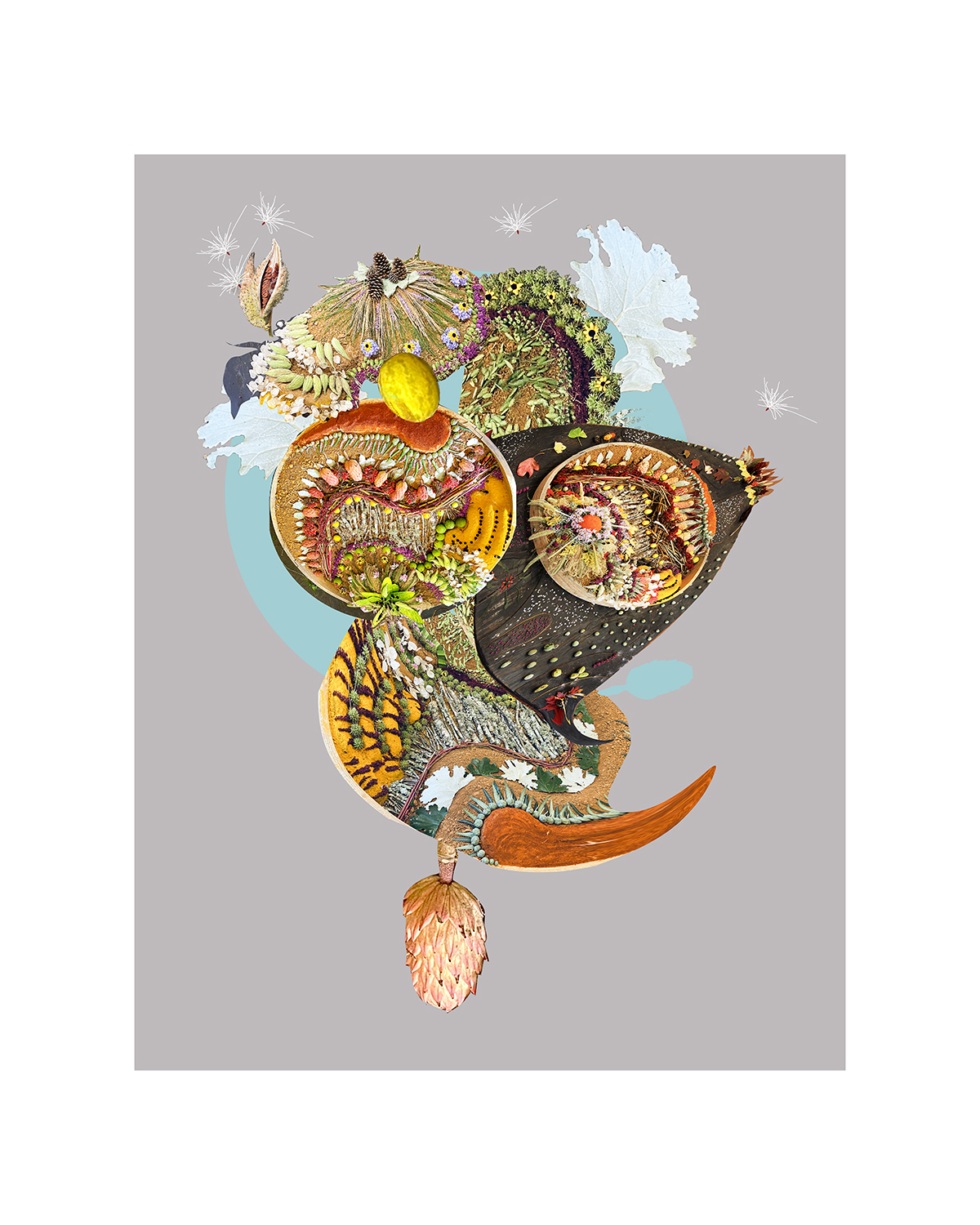 As an artist with a long history in photography, digital manipulation, performance art and installation, my practice of creating forms from an authentic relationship to the earth fuses all mediums. The heightened moment of completion is photographed and becomes an archival print, an artifact of the momentary (or temporal moment). Making in places where others circulate ‘outside’ is a significant performative aspect to my work. I often place forms in high circulation areas and leaving collected found materials where people would feel comfortable adding to each Terra Form. Sometimes I invite specific groups or pedestrians to work with me or refresh the work with newly collected foliage in the following days. The experience is to be shared, changed and felt by others, with the hopes of inspiring a deeper engagement to the sophistication and balance of the natural world. After years of separating ourselves with climate controlled lodging and impervious surfaces, this “Terra Forma” series seeks to encourage others to feel the air that is, the leaves that tremble, and the earth beneath their feet.”